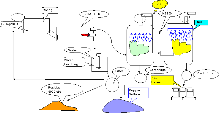 Roasting of copper concentrates represent a major source of enviromental contamination. When copper sulfides are roasted poisonous SO2 ( sulphur dioxide) gases are produced, and in many operations of this type in the world these gases are not treated but released to the atmosphere as such. The transformation of these gases into sulphuric acid is expensive and the world produces already too much sulphuric acid. In this study we have found that roasting copper sulfides concentrates with ammonium sulphate produces a sublimate of ammonium sulphide that can be treated to regenerate the reagent ammonium sulphate to treat more concentrates. The gas produced in this second operation- hydrogen sulphide-can be reduce to elemental sulphur or washed with an alkali, as sodium hydroxide or calcium hydroxide-to render it as a solid compound.